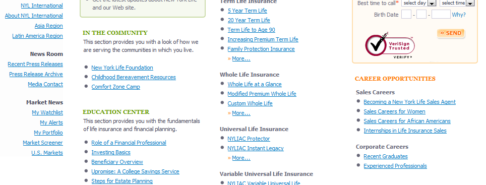 Take, for example, the insurance company website newyorklife.com – the homepage of this website is mostly a long list of links. Visitors to this type of site need to know beforehand what they are looking for.